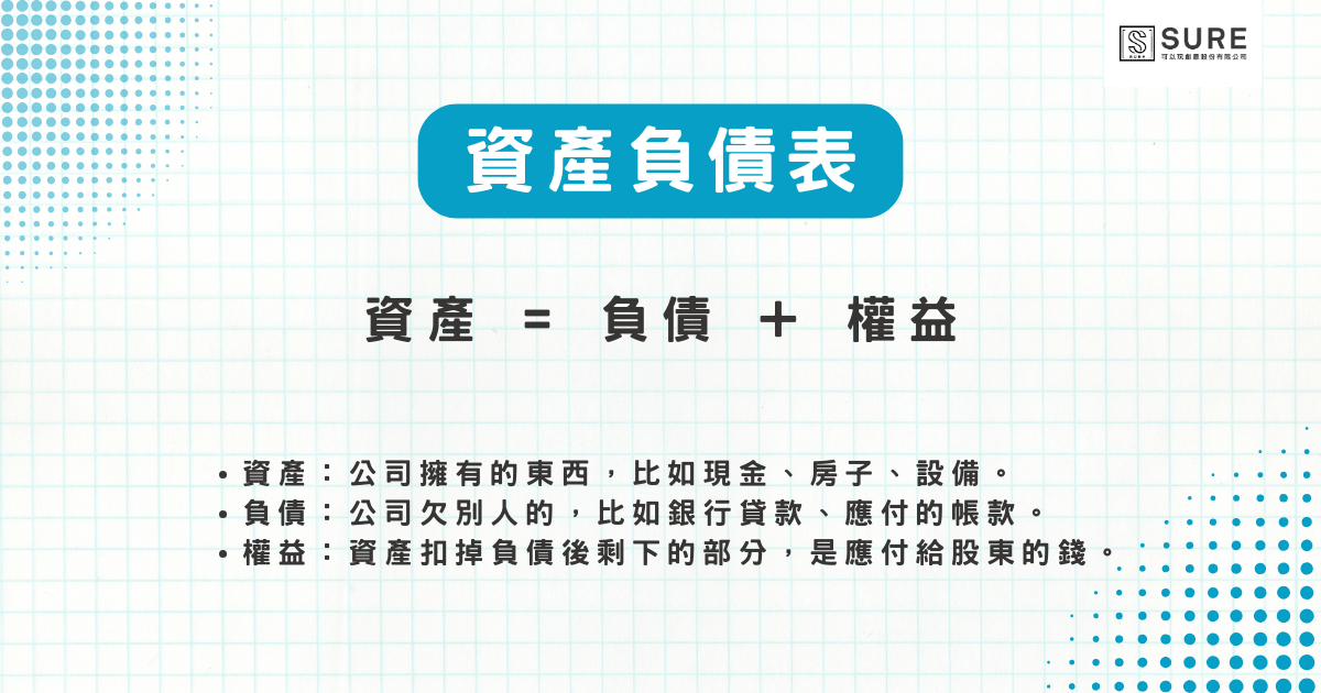 - 資產:公司擁有的東西,比如現金、房子、設備。
