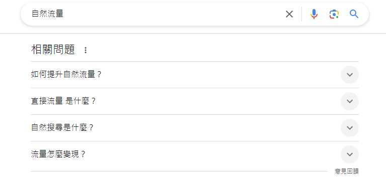 以自然流量的SERP介面為例,我們可以看到Google針對一些延伸問題,總結出了一些網站裡的答案,這些網站不一定是搜尋結果前十名的網頁,問題的問句也不見得是常見的長尾關鍵字,但是剛開始做SEO時,可以試著根據這些問題做文章的段落標題。