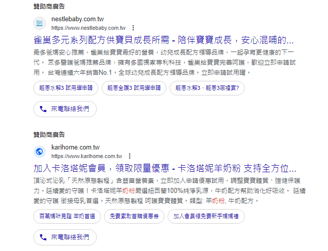 除了可以免費操作的SEO行銷之外,也會有一些付費的廣告欄位,可以透過付出金錢的方式,讓自己的網站或是商品出現在搜尋結果中,通常出現的位置會在SERP介面的最上與最下方;付費廣告的好處是絕對的曝光率,不需要辛苦拚殺搜尋引擎排名,壞處是一旦停止付費,曝光率將會直接歸零。