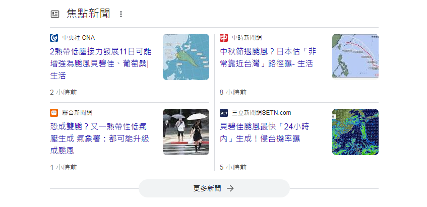 如果搜尋的關鍵字是最近的熱門新聞或是跟時事相關,例如:奧運、天災、演藝圈、重大事故等等,就有高機率會出現新聞欄目,尤其是政治相關敏感議題,出現新聞欄的機率極高。